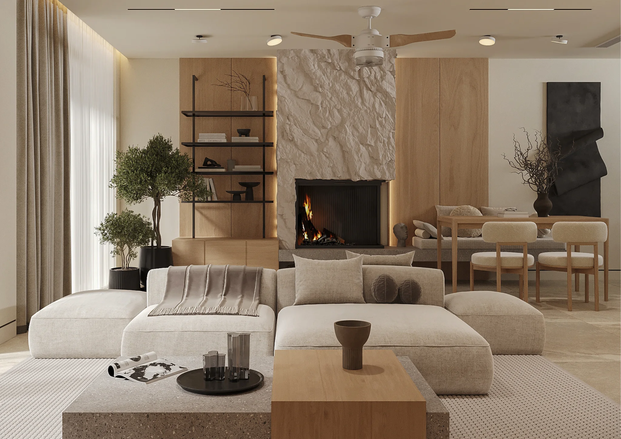 تجمع غرفة المعيشة هذه بين التناغم الطبيعي وعناصر التصميم العصرية. تُضفي الألوان الترابية والمواد الطبيعية، مثل الحجر والخشب، أجواءً دافئةً مثاليةً للاسترخاء وكرم الضيافة. صُممت الإضاءة لإبراز ملمس المواد، بينما تُضفي الخطوط البسيطة لمسةً من الفخامة العصرية. تُكمل المدفأة والنباتات […]