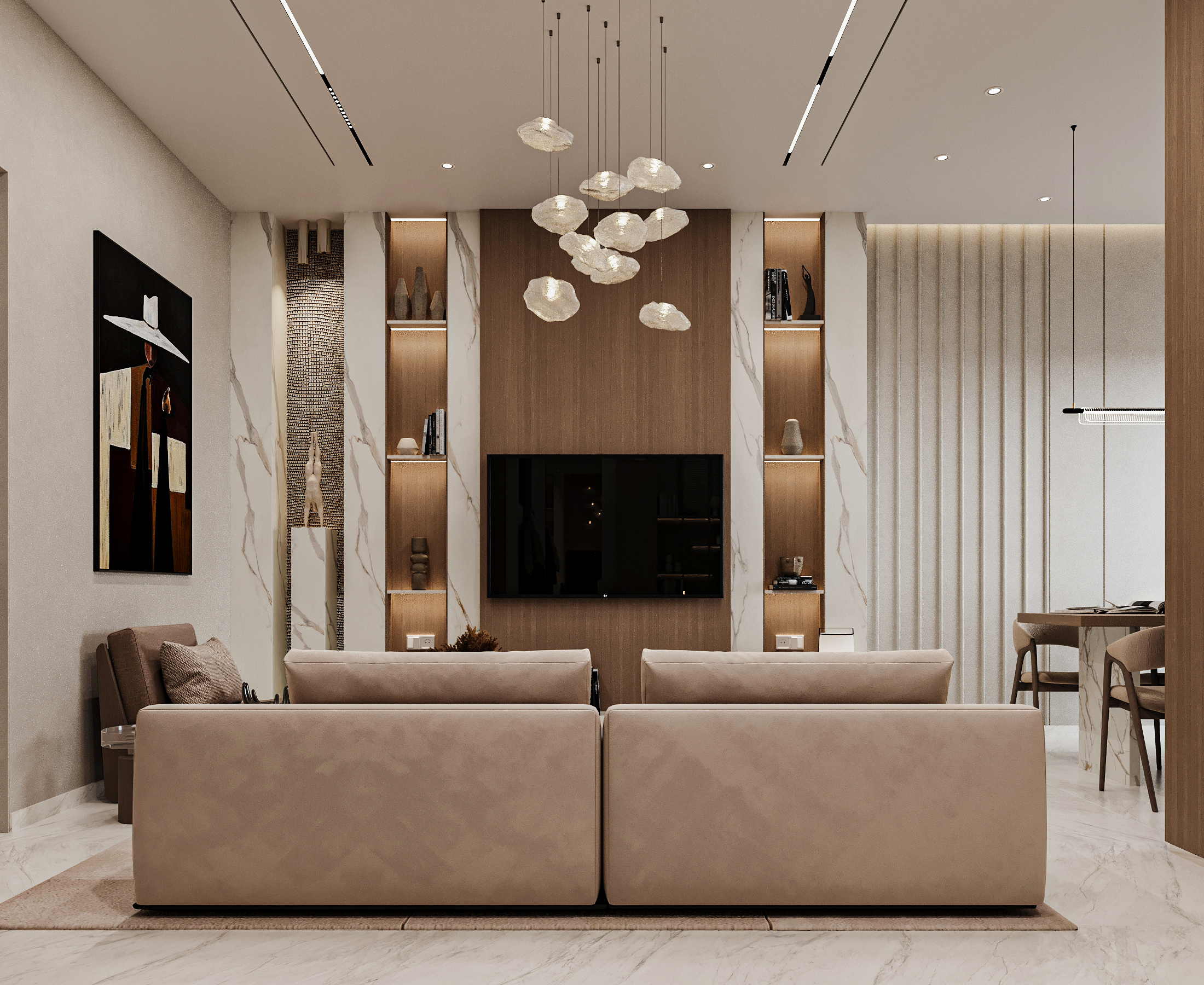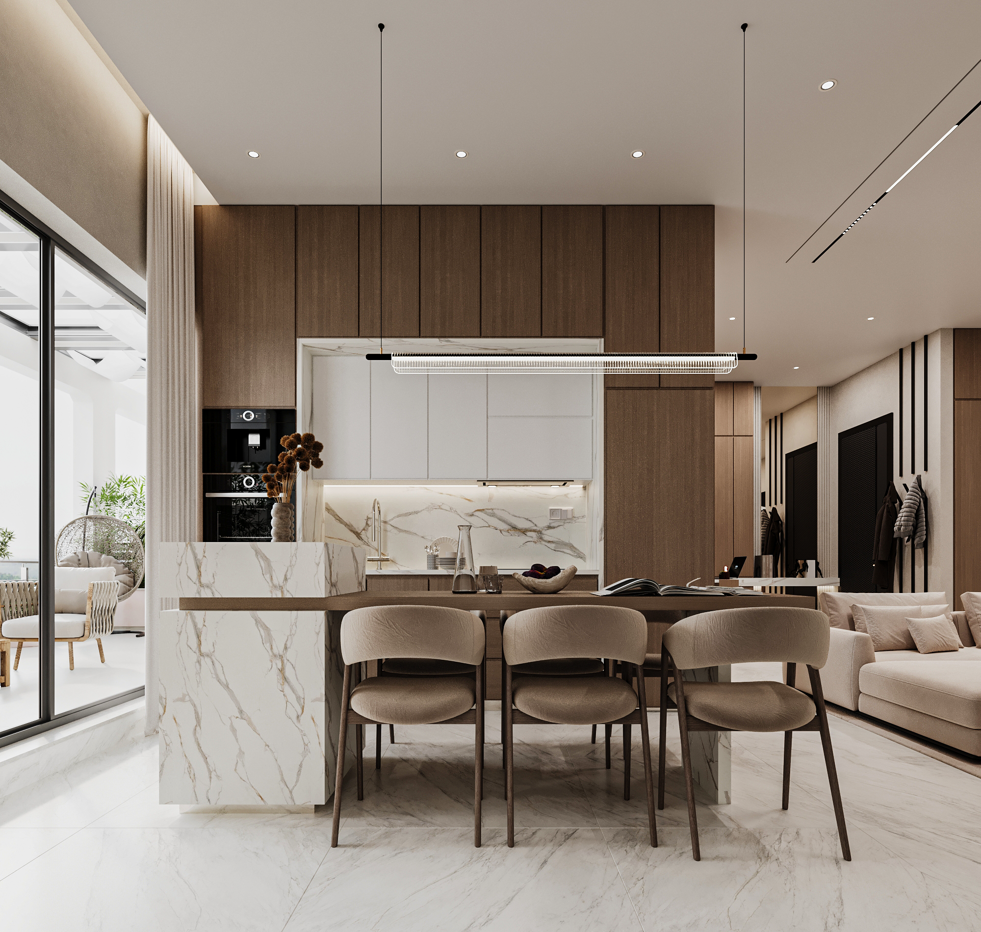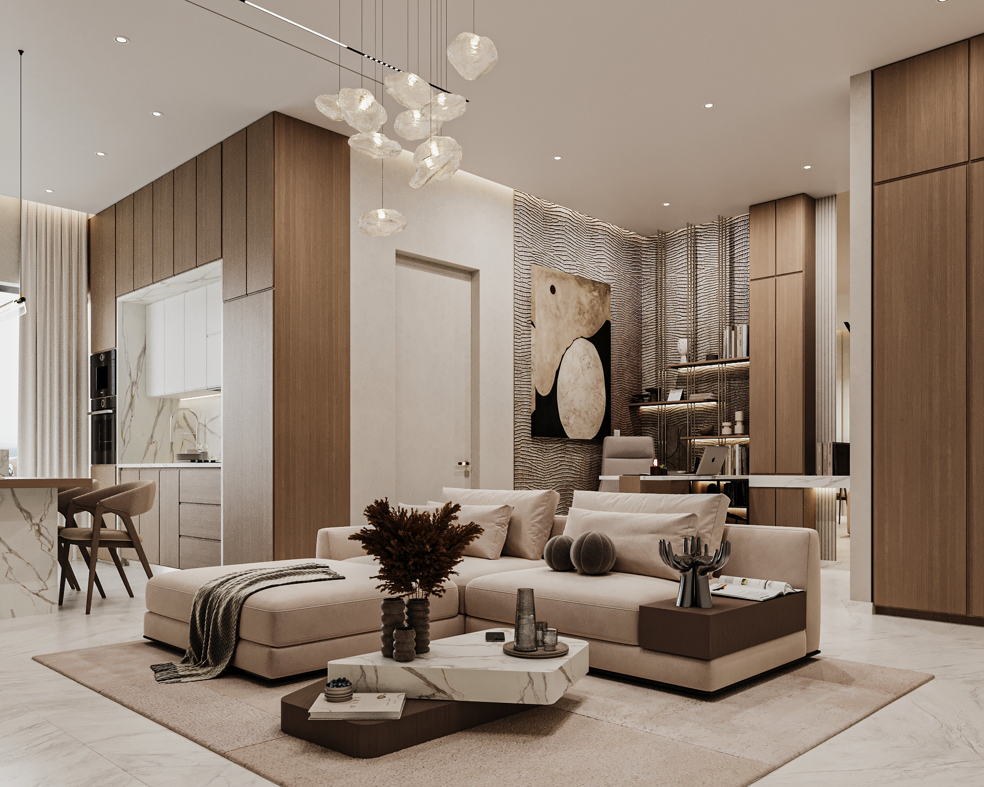 Η μελέτη επικεντρώθηκε στον αρχιτεκτονικό σχεδιασμό και στη λειτουργική αναδιάταξη της κάτοψης, ενοποιώντας καθιστικό, τραπεζαρία και κουζίνα σε έναν ενιαίο, φωτεινό χώρο. Το φυσικό μάρμαρο, οι θερμές ξύλινες επενδύσεις και ο διακριτικός φωτισμός αναδεικνύουν ένα ισορροπημένο luxury design με καθαρές γραμμές και διαχρονική αισθητική.