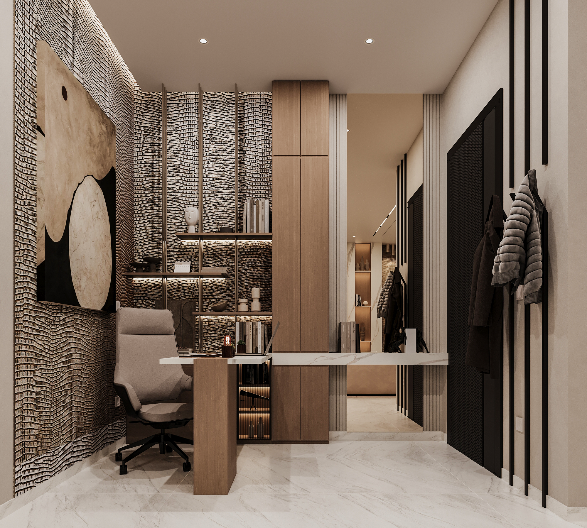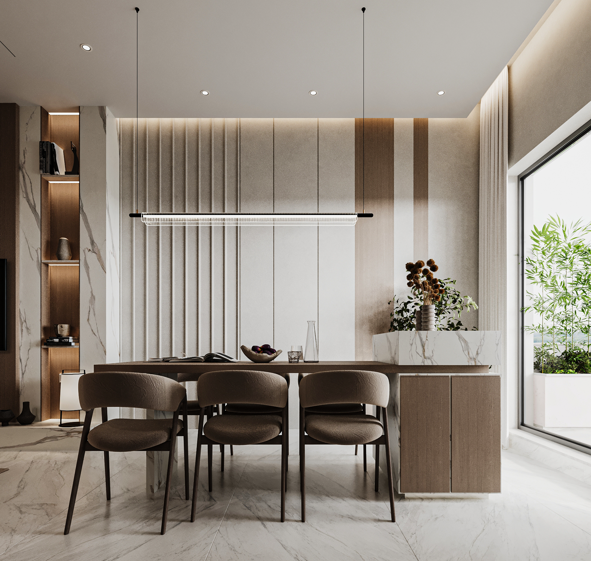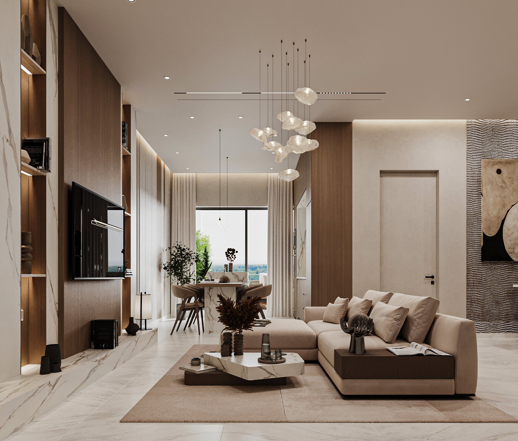 Η μελέτη επικεντρώθηκε στον αρχιτεκτονικό σχεδιασμό και στη λειτουργική αναδιάταξη της κάτοψης, ενοποιώντας καθιστικό, τραπεζαρία και κουζίνα σε έναν ενιαίο, φωτεινό χώρο. Το φυσικό μάρμαρο, οι θερμές ξύλινες επενδύσεις και ο διακριτικός φωτισμός αναδεικνύουν ένα ισορροπημένο luxury design με καθαρές γραμμές και διαχρονική αισθητική.