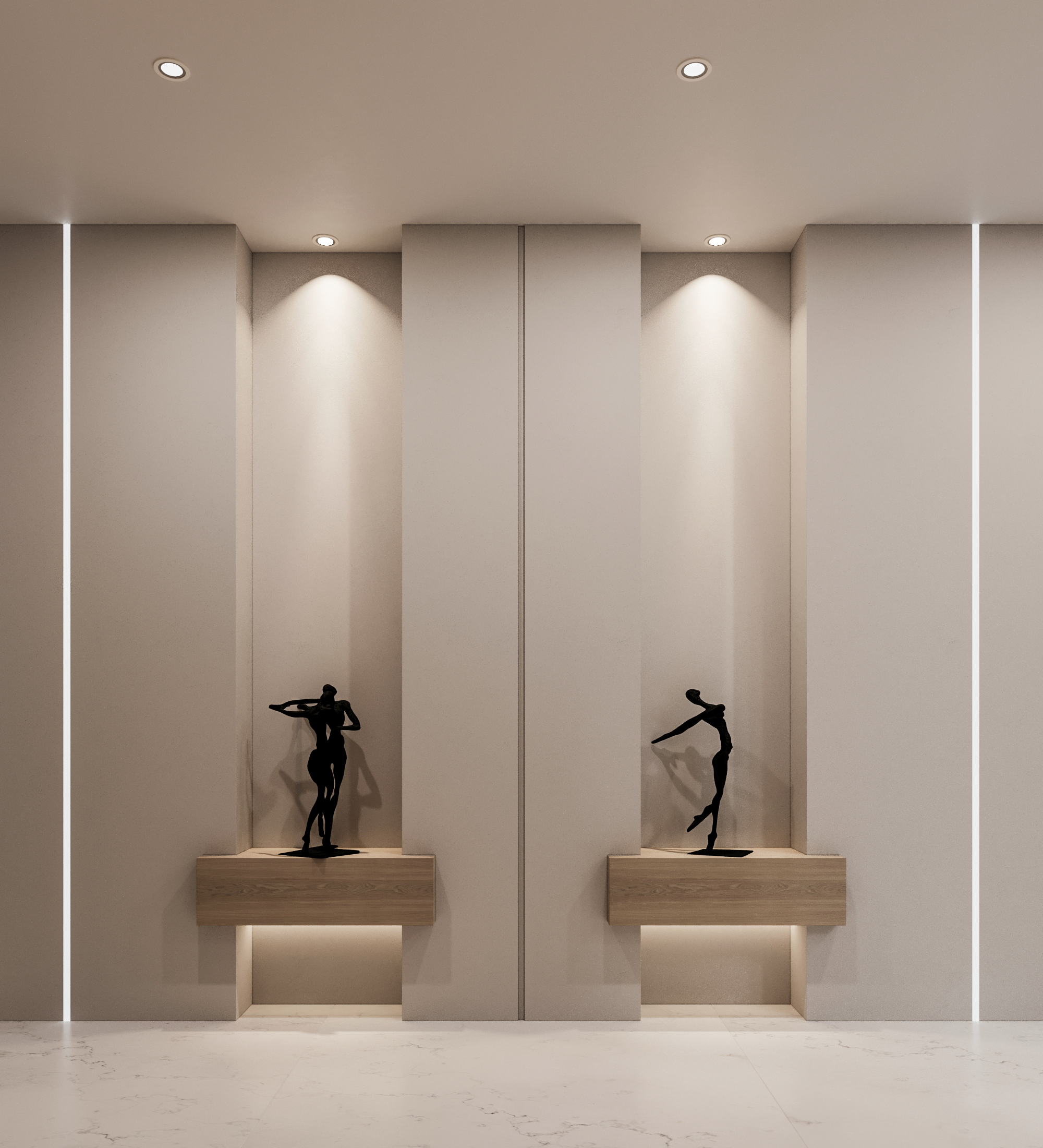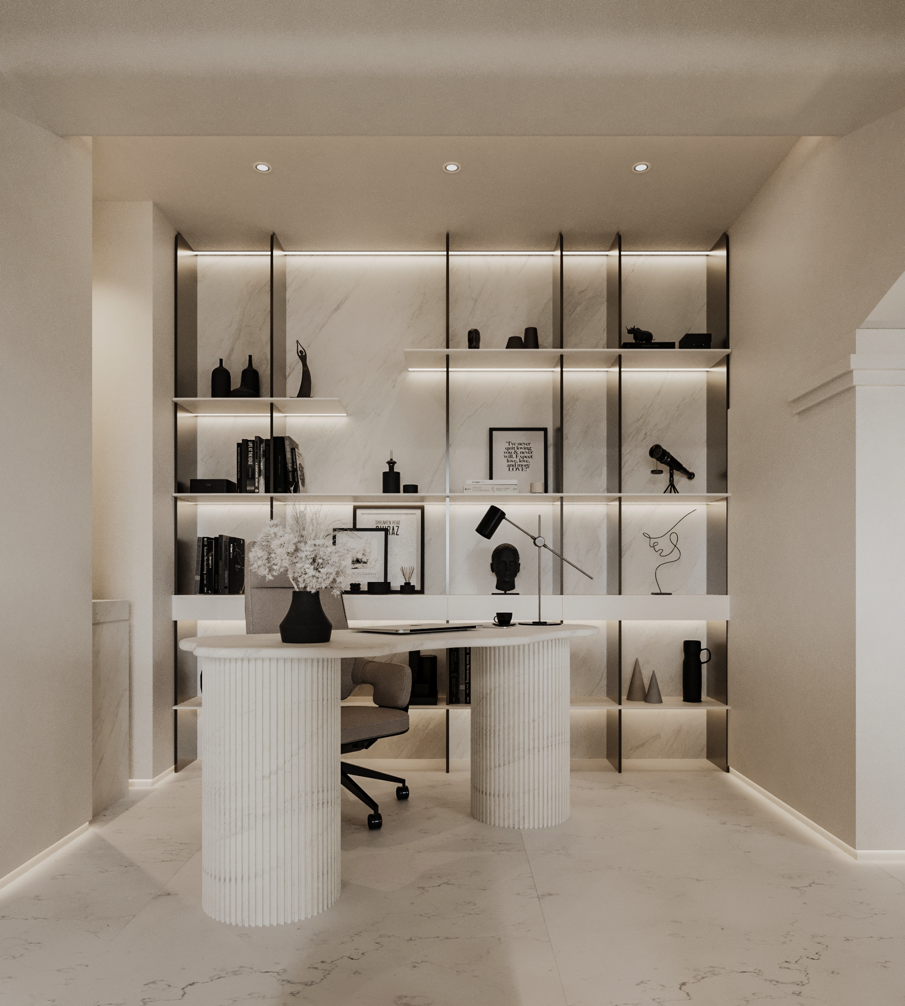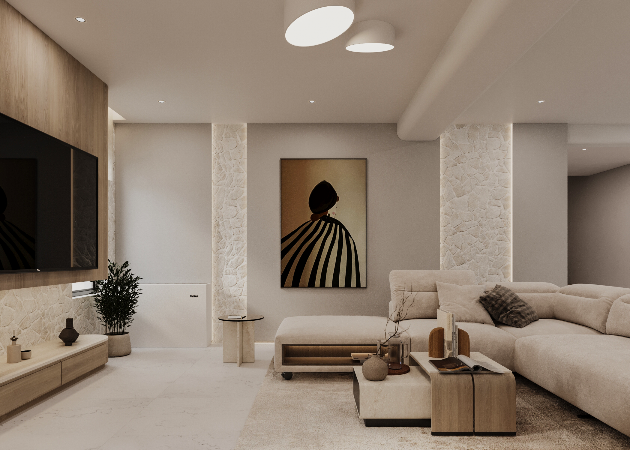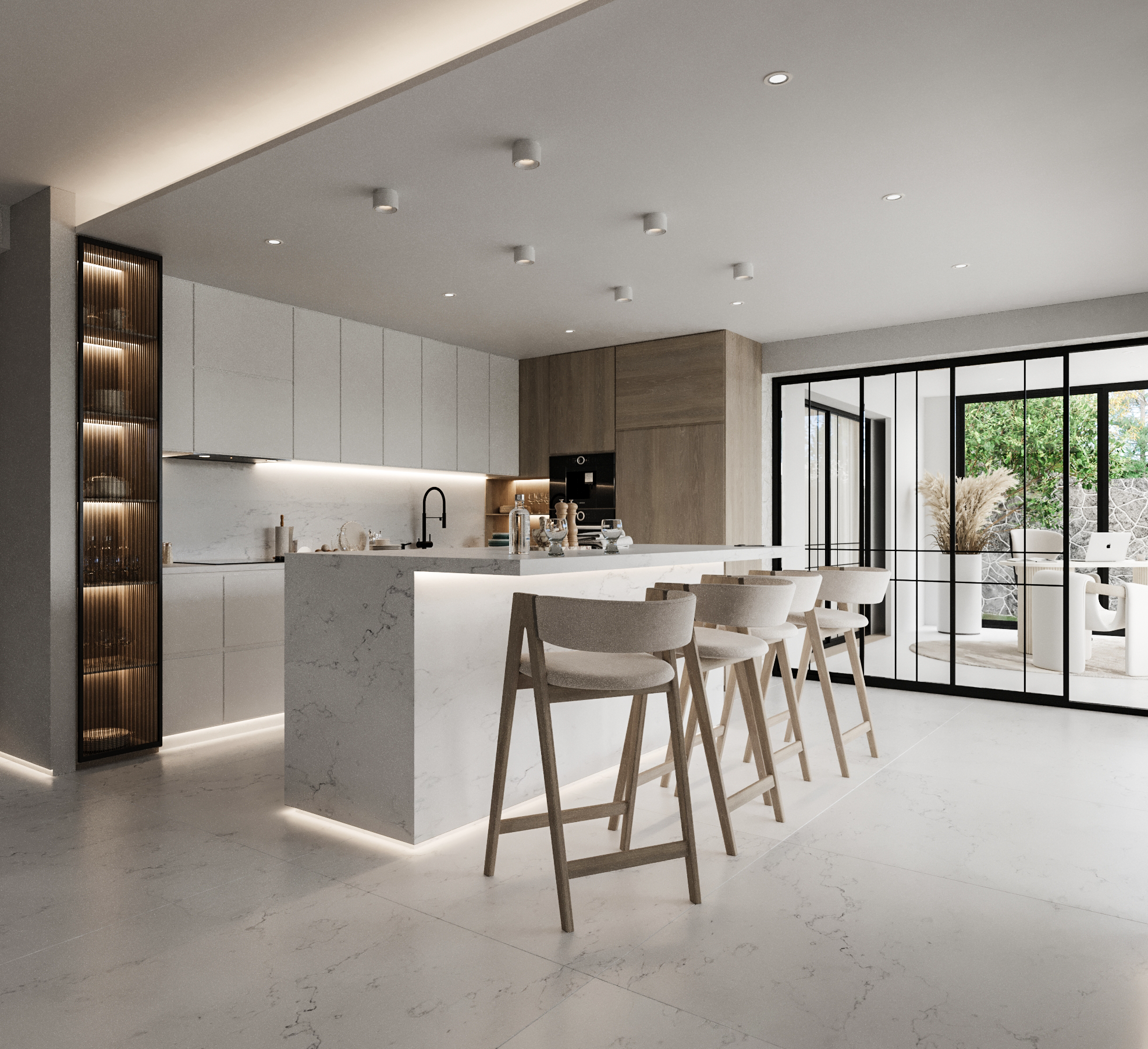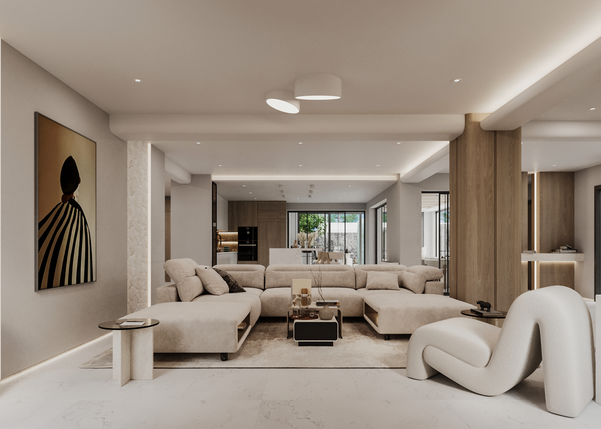 Στον πυρήνα της κατοικίας, το καθιστικό και η κουζίνα διαμορφώνονται ως ένας ενιαίος, ρευστός χώρος με custom-made κατασκευές, κρυφό φωτισμό και λεπτομέρειες υψηλής αισθητικής. Οι επενδύσεις σε φυσική πέτρα και ξύλο, οι καθαρές γραμμές και τα ενσωματωμένα στοιχεία αποθήκευσης συνθέτουν ένα περιβάλλον σύγχρονης πολυτέλειας χωρίς υπερβολές.