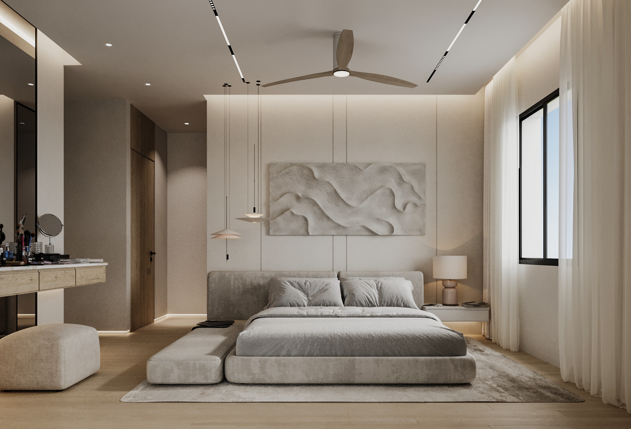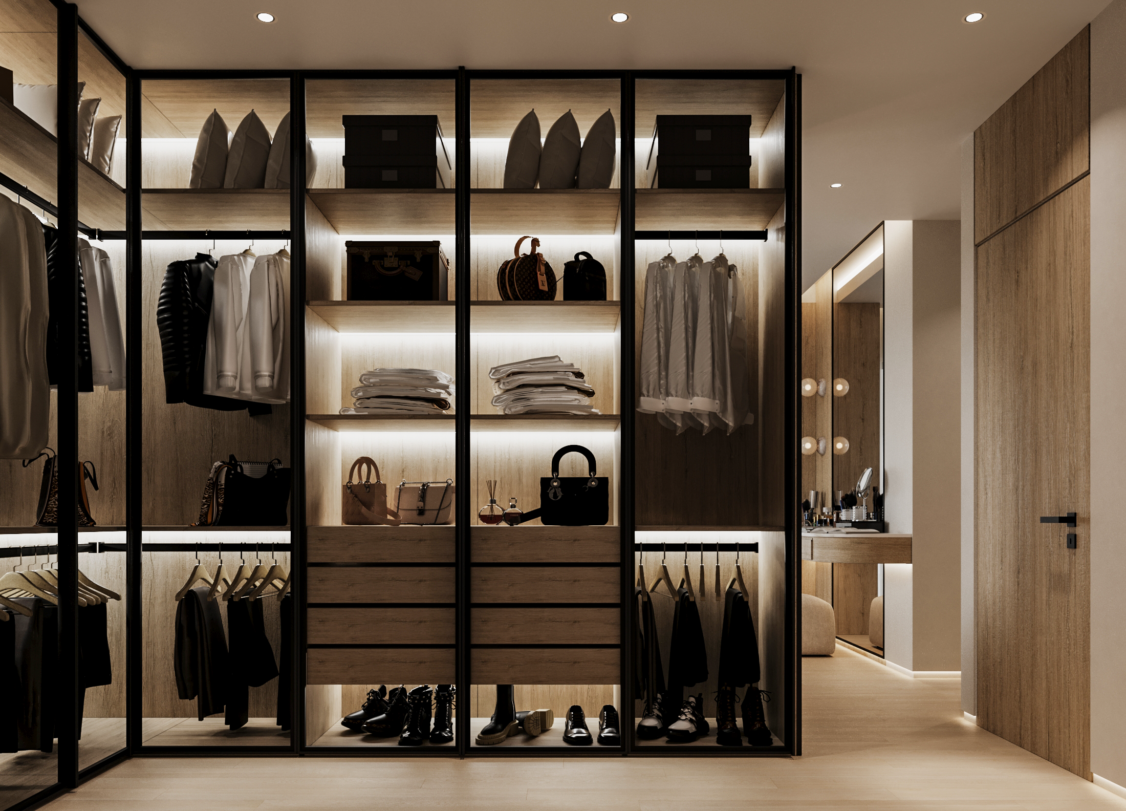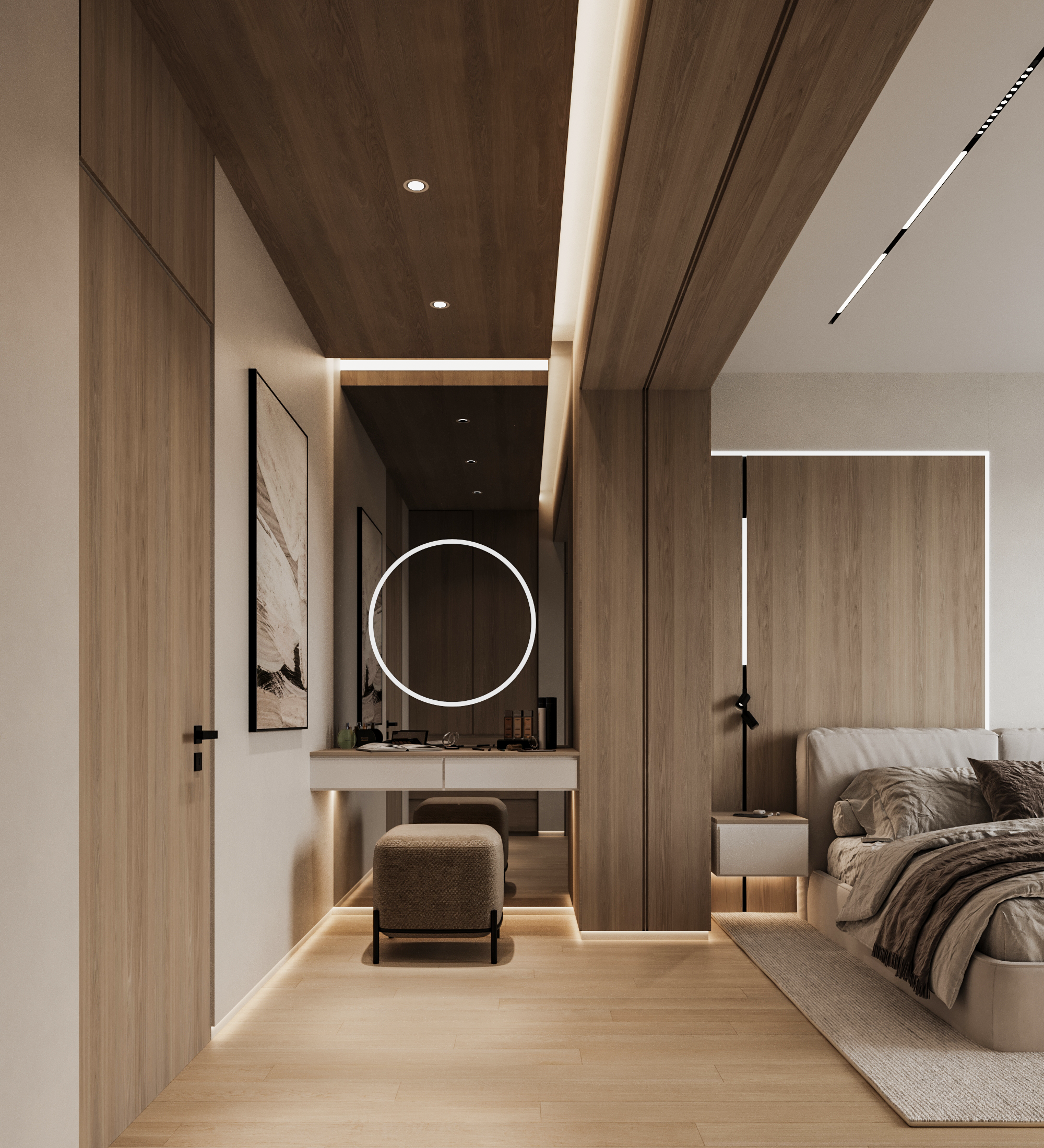 Η κρεβατοκάμαρα και το walk-in closet σχεδιάστηκαν με έμφαση στη λειτουργικότητα και την εργονομία, μέσα από bespoke λύσεις που αναδεικνύουν την ποιότητα των υλικών και την ακρίβεια της κατασκευής.