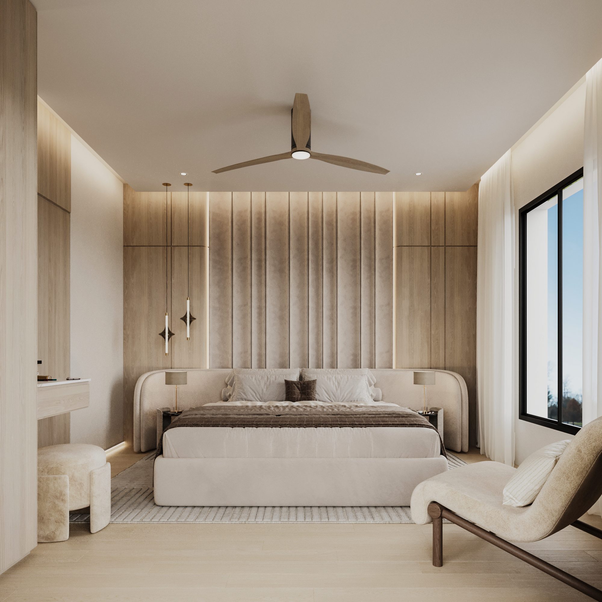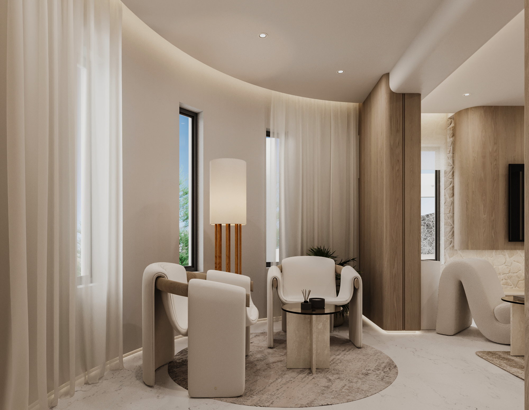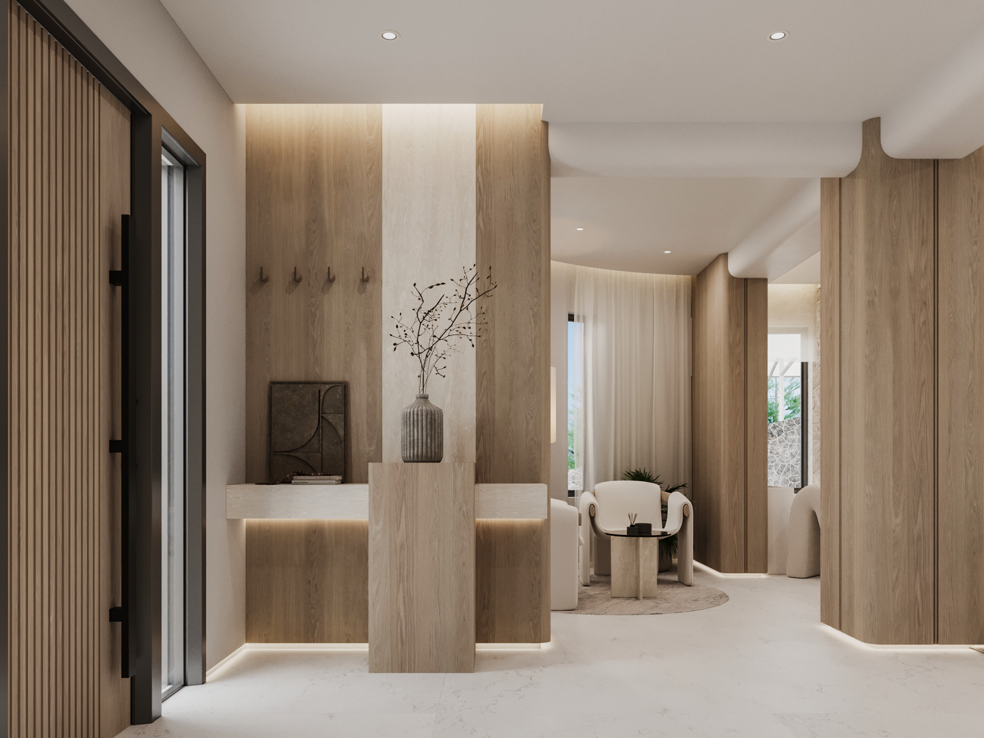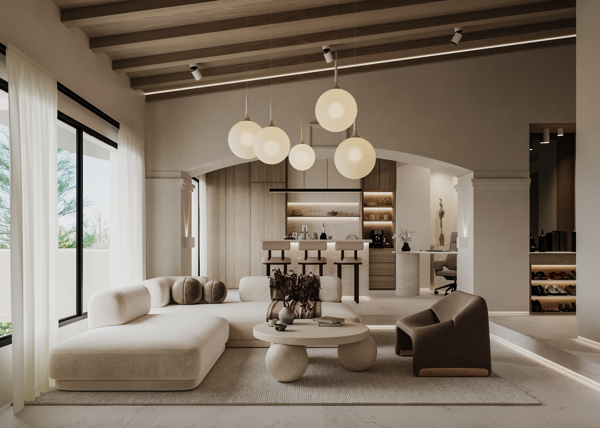 Η μελέτη βασίστηκε σε έναν ενιαίο αρχιτεκτονικό άξονα: φυσικά υλικά, ουδέτερη παλέτα και απόλυτη ισορροπία ανάμεσα σε όγκο, φως και υφή. Το εσωτερικό αναπτύσσεται με ανοιχτές χαράξεις, μεγάλες υαλοστάσεις και άμεση σύνδεση με τον εξωτερικό χώρο, ενισχύοντας την αίσθηση ιδιωτικότητας και ηρεμίας.